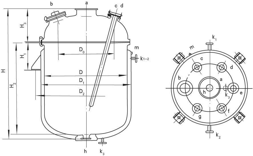 | 公称容积L | 实际容积L | 夹套换热面积 | 尺寸 | 管口尺寸 | 重量 | ||||||||||||||
